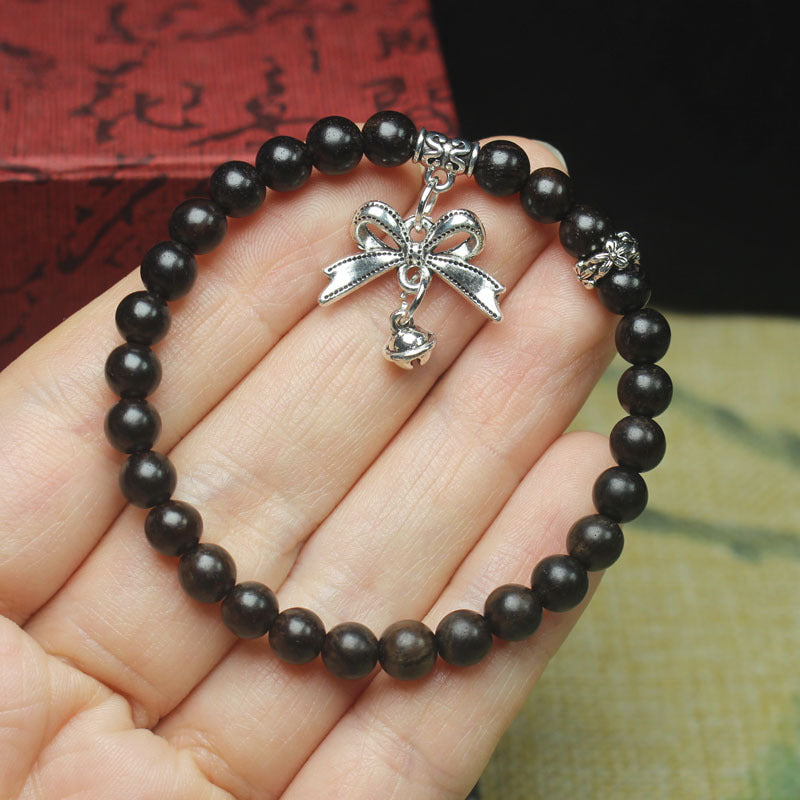 Ebony Wood Bead Bracelet – 6mm with Bow Charm & Bell Pendant, Elastic Fit