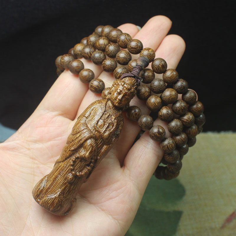 Agarwood Beaded Necklace – 8mm Round Beads with Carved Guanyin Pendant