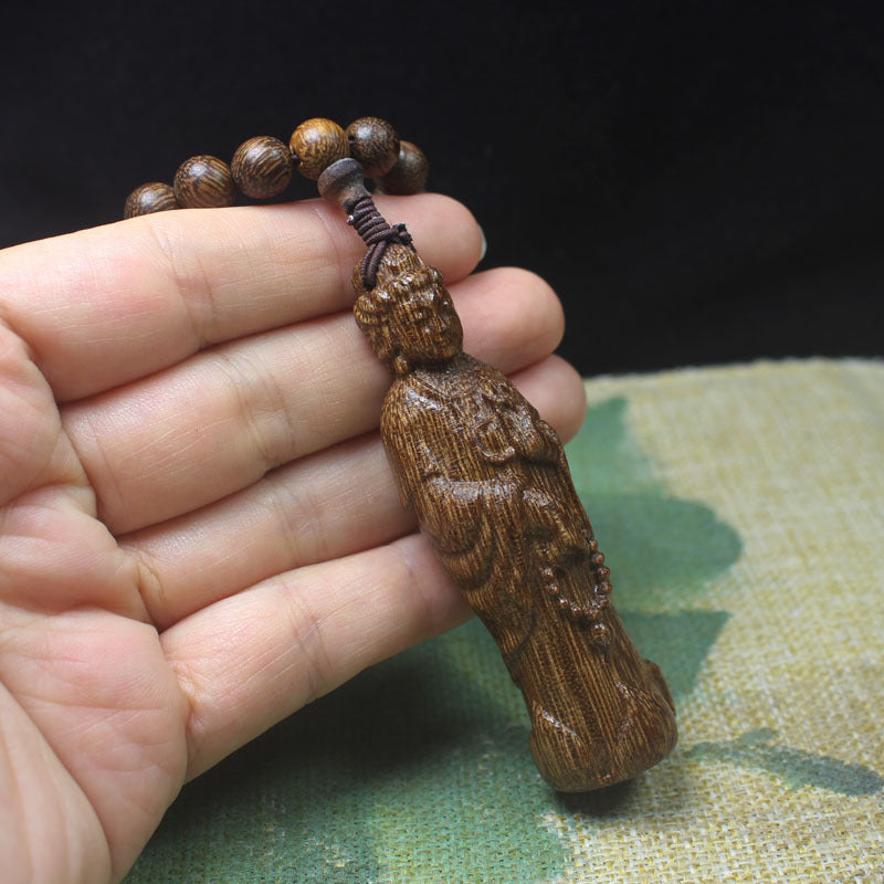 This handcrafted necklace features 8mm agarwood beads strung with a finely carved Guanyin pendant — the Goddess of Mercy in Chinese culture, symbolizing compassion, peace, and spiritual guidance.