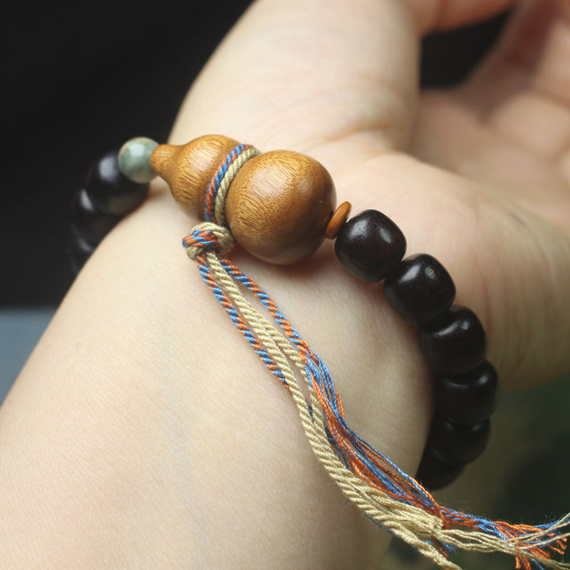 This handcrafted elastic bracelet features 9mm dark red sandalwood-style beads, accented with a carved pear wood gourd and a multicolor woven tassel. In traditional Chinese symbolism, the gourd (hulu) is associated with protection, health, and spiritual blessing.